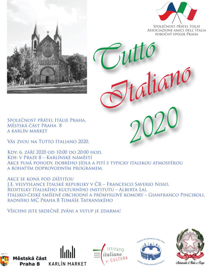 Tutto Italiano 2020 è organizzato da Společnost přátel Itálie Praha - Associazione Amici dell'Italia - Praga in collaborazione con il Comune di Praga 8 e Karlín Market.